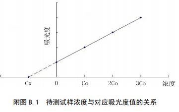 分別量取4等份量待測試樣(濃度為Cx),配制總體積相同的4份溶液。第一份不加標(biāo)準(zhǔn)溶液,第二、三、四份分別按比例加入不同濃度的標(biāo)準(zhǔn)溶液,4份溶液的濃度分別為:Cx、Cx+Co、Cx+2Co、Cx+3Co,加入標(biāo)準(zhǔn)的最小濃度Co≈0.5Cx。用空白溶液調(diào)零,在相同條件下依次測定4份溶液的吸光度值。以吸光度值為縱坐標(biāo),加入標(biāo)準(zhǔn)溶液的濃度為橫坐標(biāo),繪制校準(zhǔn)曲線,曲線反向延伸與橫坐標(biāo)的交點(diǎn)即為待測樣品的濃度。該方法只適用于濃度和吸光值呈線性的區(qū)域。待測試樣濃度與對(duì)應(yīng)吸光度值的關(guān)系見附圖A.1。