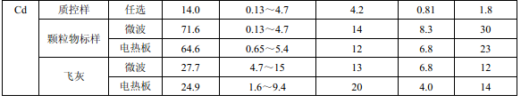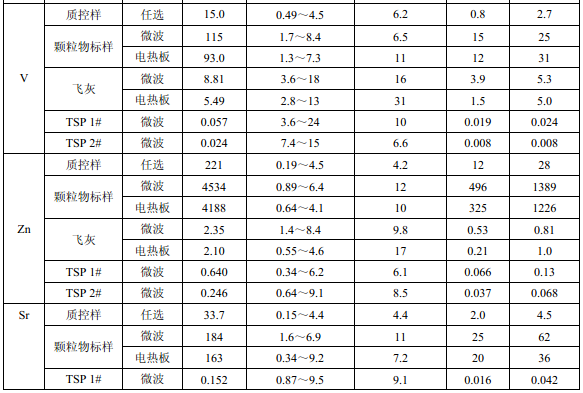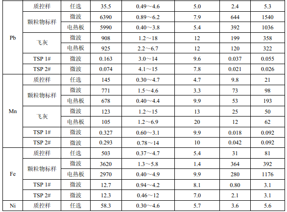 濾膜質(zhì)控樣品由美國職業(yè)健康研究所提供(A-3.1)。顆粒物標(biāo)樣為美國 NIST(1648a)。 樣品消解處理采用硝酸-鹽酸混合溶液(5.6),定容體積為 50.0 ml。不同類型樣品測定值濃 度(或含量)單位分別為:質(zhì)控樣(μg )、顆粒物標(biāo)樣(μg/g)、飛灰樣品(μg/g)和 TSP 樣品(μg/cm 2 )。其中顆粒物標(biāo)樣中 Al 、Ca、K 元素含量單位為重量百分比(% )。