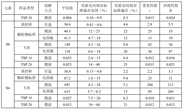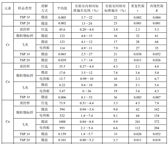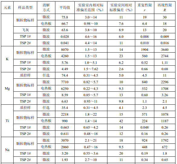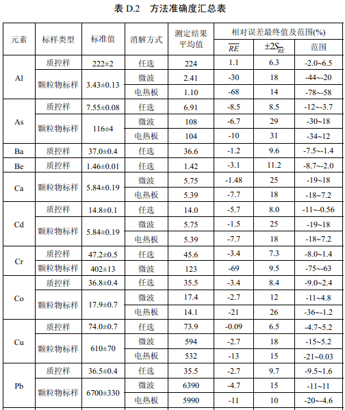 7家實(shí)驗室分別對統(tǒng)一提供的大氣顆粒物標(biāo)樣、濾膜質(zhì)控樣品、飛灰樣品(廢氣顆粒物模擬樣品)和2 個顆粒物負(fù)載量不同的TSP 樣品,同時取6 份平行樣品分別進(jìn)行微波消解 (7.2.1.1 )和電熱板消解(7.2.1.2 ),用等離子體發(fā)射光譜法測量。對測定結(jié)果進(jìn)行數(shù)理統(tǒng) 計,得到方法的精密度(各元素測定值的實(shí)驗室內(nèi)標(biāo)準(zhǔn)偏差范圍、實(shí)驗室間標(biāo)準(zhǔn)偏差、重復(fù) 性限和再現(xiàn)性限)和方法的準(zhǔn)確度(各元素測定值的相對誤差范圍和相對誤差最終值),詳 見附錄D。