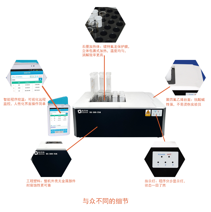 DS-360-25H高溫石墨消解儀具有無線控制技術實現(xiàn)遠程操作實驗、時刻掌握動態(tài)。無線的設計讓操作者遠離酸霧,避免對人體直接接觸,保障人員安全。高溫石墨消解儀儀器采用高純石墨作為加熱體,包裹式加熱,石墨材質(zhì)可以讓溫度更均勻,效率更高。多孔的設計,輕松實現(xiàn)了批量的處理樣品,節(jié)省了大量的時間,提高工作效率,是您實驗室樣品前處理消解的好伙伴。
