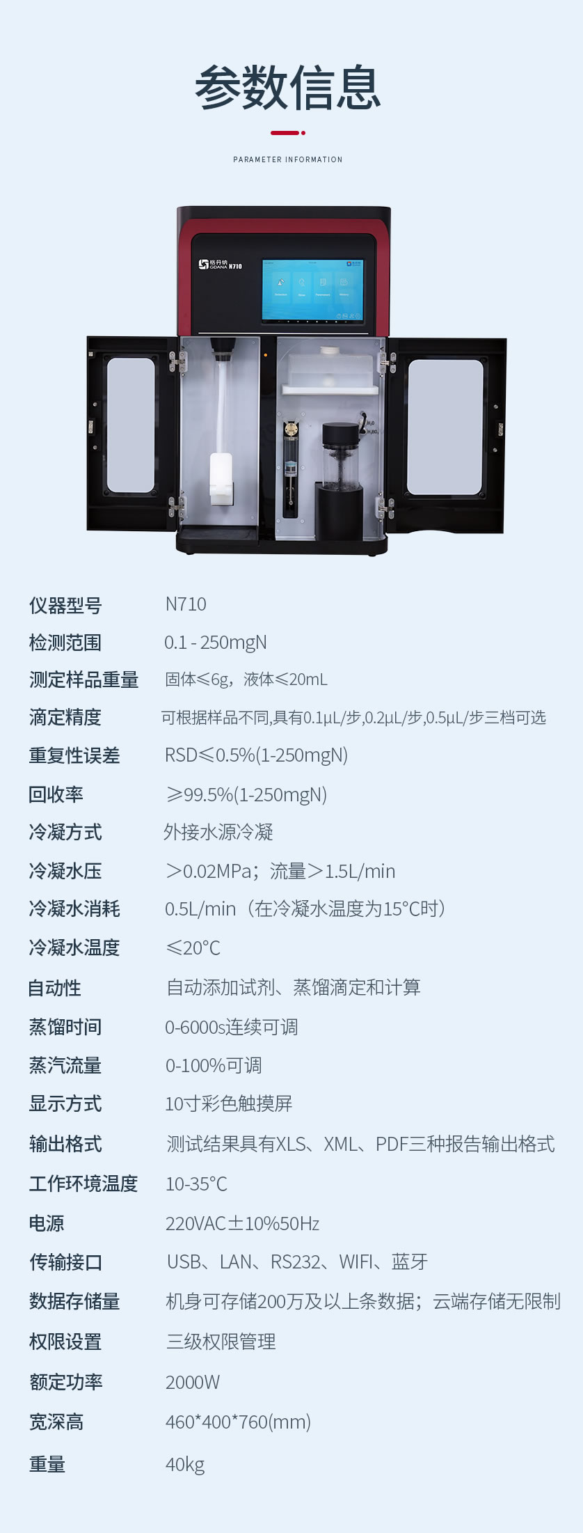 新一代N710全自動凱氏定氮儀集成了自動加堿加酸、自動加稀釋劑、蒸餾滴定、消化管排空、溶液液位監(jiān)測、超溫監(jiān)測、清洗排廢、結(jié)果計算等功能。采用符合國家標準的凱氏定氮方法:濃硫酸環(huán)境消解樣品、堿性環(huán)境蒸汽蒸餾、硼酸吸收、加指示劑滴定、終點顏色判定法。