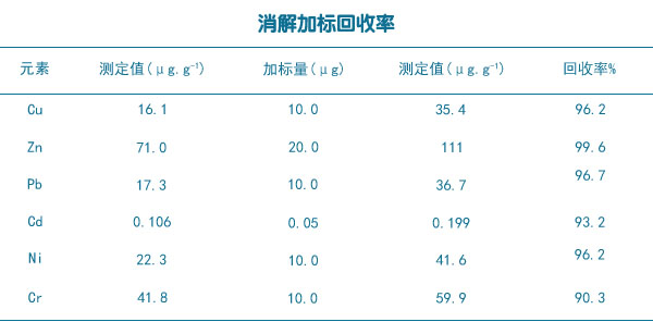 稱取若干份0.5g(精確至0.0001g)棕壤土樣品,分成平行的兩組,其中一組加入一定質(zhì)量的標(biāo)液,然后用全自動石墨消解儀法對兩組樣品進行消解,完成后對土壤樣品中的Cu、Zn、Pb、Cd、Ni和Cr六種重金屬元素含量進行分析,計算樣品加標(biāo)回收率如下表所得。