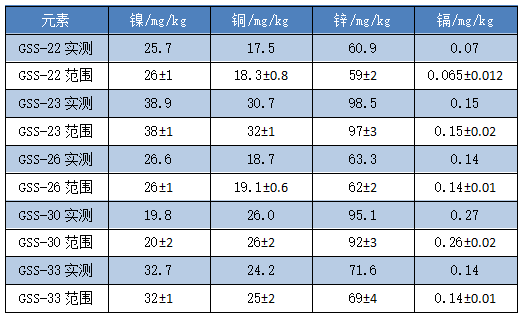 實驗發(fā)現(xiàn)除GSS-23的銅元素檢測值略低于不確定度范圍, GSS-30的鋅元素檢測值略高于不確定度范圍,其余樣品的四類元素檢測結(jié)果均在標(biāo)準(zhǔn)值不確定度范圍之內(nèi),滿足實驗室土壤檢測實驗的要求。
